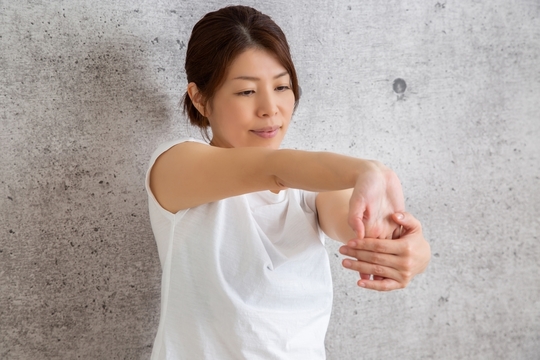 肘まわりが痛くなる原因のひとつとして、前腕部の筋肉の緊張、血行不良が考えられます。入浴時に、水を入れた洗面器などに、30秒くらい肘から前腕にかけて水に浸け、そのあと洗面器から腕を出し、すぐに、湯船の中に腕をつけて、腕に温かさを感じてください。