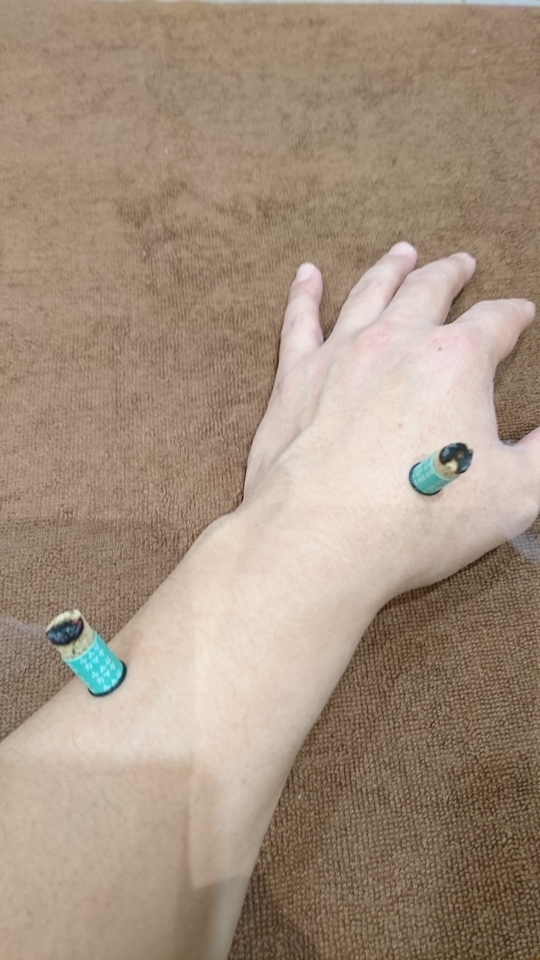当院では、火傷のあとが残らないように、気持ちよいお灸の温熱効果を感じてもらうのに、間接灸という、円筒上のお灸で、皮膚から1cmほど離れて、直接肌に触れないような構造の、お灸をメインに使用しています。 お灸の温かさを楽しんでいただけるかと思います。