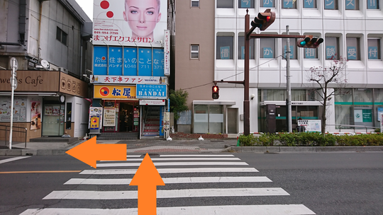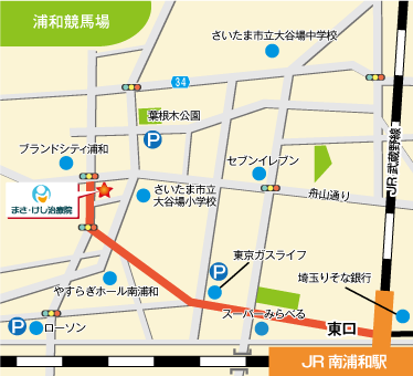 ① 南浦和駅の改札を出て左側へ。階段を降りて東口に出ましたら、正面 に見える、松屋さん、不二家さんの所の信号を渡って、左側へ道なりに進んでください。